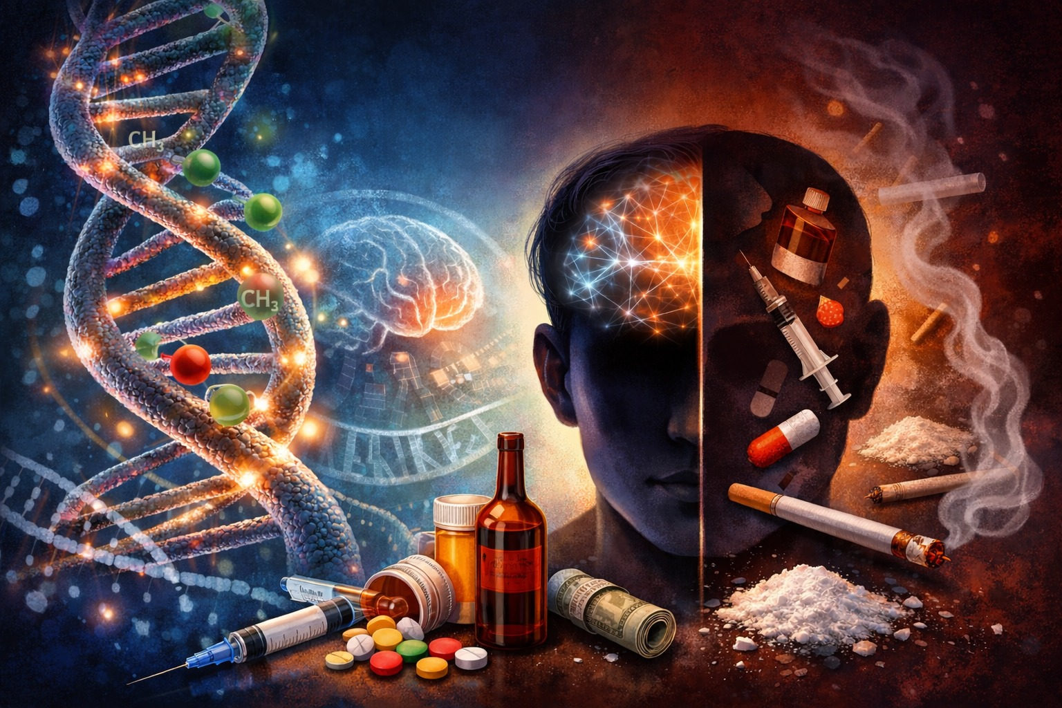 La adicción a las drogas no solo implica cambios en la conducta, sino también profundas modificaciones a nivel molecular en el cerebro, como cambios epigenéticos en las neuronas del circuito de recompensa que es una red de estructuras neuronales que genera placer y motiva comportamientos gratificantes que definen la adicción, pues regulan la expresión génica. Estas adaptaciones epigenéticas inducidas por drogas generan alteraciones en la función cerebral, por ejemplo: la acetilación de histonas H3 y H4 aumenta con el uso de cocaína, opiáceos, alcohol y nicotina, lo que facilita la activación transcripcional; también se han observado modificaciones epigenéticas tras la exposición a cannabinoides. Por ejemplo, hay un estado de metilación más elevado en el promotor del gen cnr1, que codifica el receptor de cannabinoides-1 (CB1R), en los sujetos con dependencia al Tetrahidrocannabinol (THC), en comparación con los de un grupo control. Esta alteración se correlacionó negativamente con la expresión de ARNm de CB1R, lo cual sugiere la participación de la metilación de cnr1 en la regulación de la dependencia a THC; dichos cambios son duraderos y contribuyen a la persistencia de comportamientos compulsivos, lo que convierte a la epigenética en un componente clave en la patogénesis de la adicción.